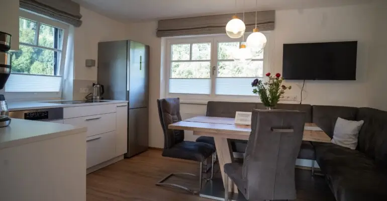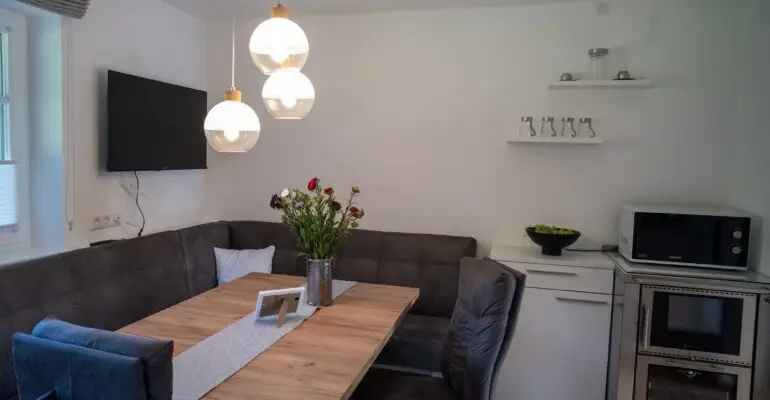 • 1 Küche (ca. 13m²) komplett ausgestattet mit Induktionsfeld, Kühl- und Gefrierschrank, Geschirrspüler, Backofen, Mikrowelle, Wasserkocher, Kaffeemaschine, Radio, div. Küchenutensilien und Essecke