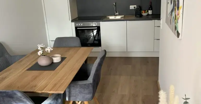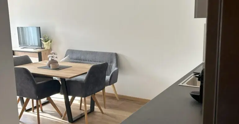 - Voll ausgestattete Wohnküche mit Geschirrspüler, Kühl- und Gefrierschrank, Backofen/Ceranfeld, Kaffeemaschine (Kapsel- oder Filtermaschine), Milchaufschäumer, Wasserkocher und Toaster, Geschirr, sowie einer kleinen TV-Ecke